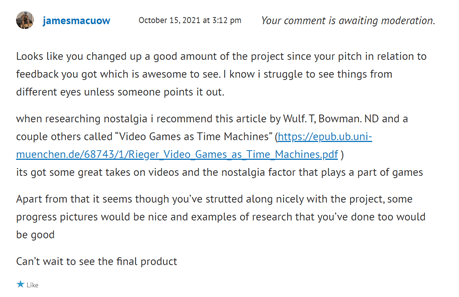 So I went right into my sources and found some stuff on nostalgia for the guy hoping it would help, because it gave me some great insight when i had a glance whilst making my project