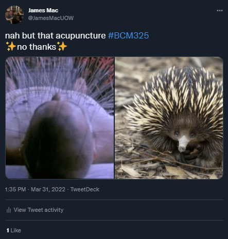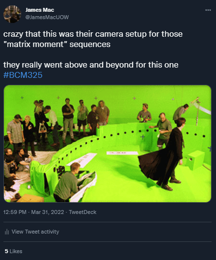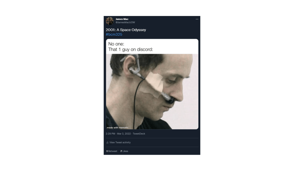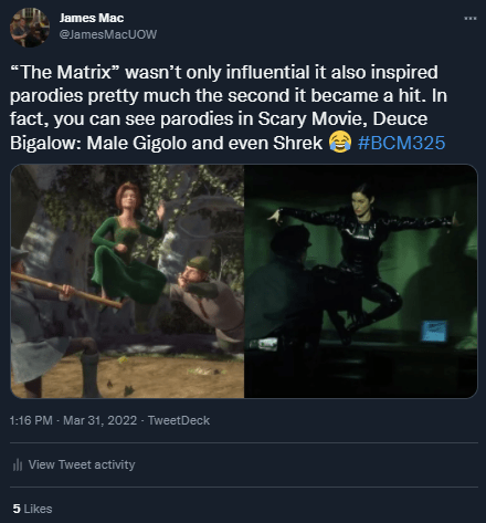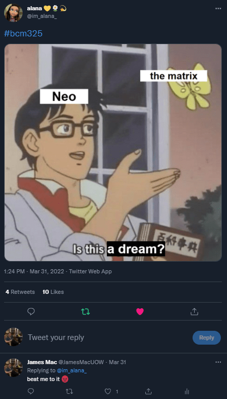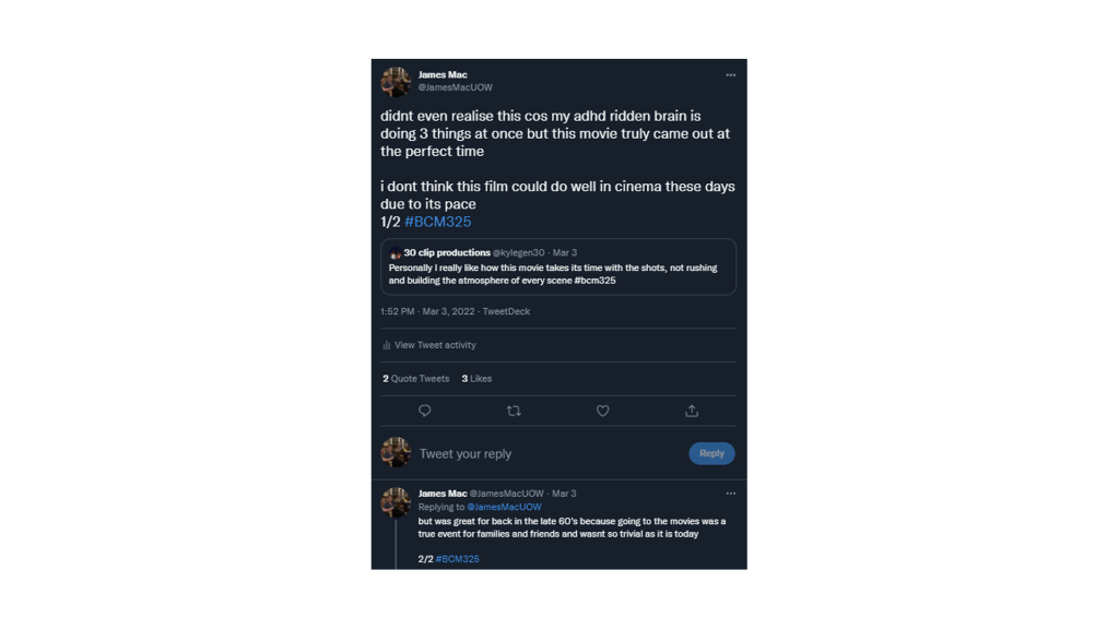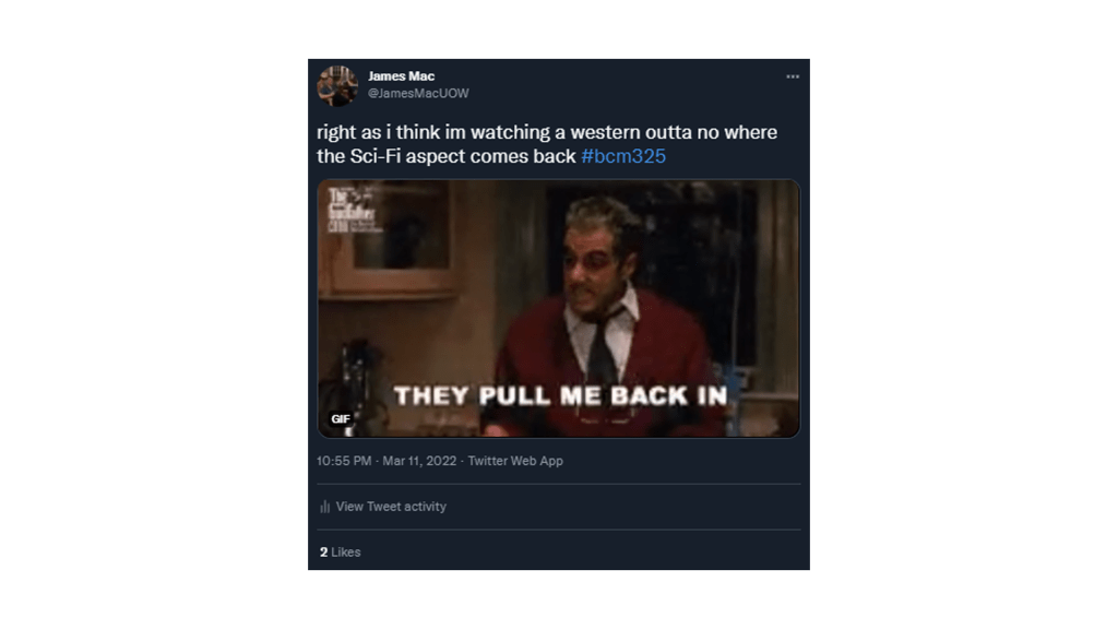 Don’t worry, I’m not going to start being that dick head in movie cinemas whos loud, phone on and just a constant annoyance BUT a huge reason why I was able to continue through some of the slower parts of the movies we watched was the interactions made between our peers through there hashtag, “#BCM325”.