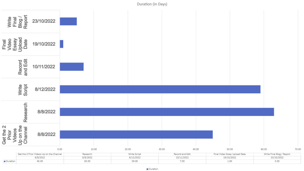 To combat that I have made a Gantt Chart to help schedule time to record, edit and research the topic at hand